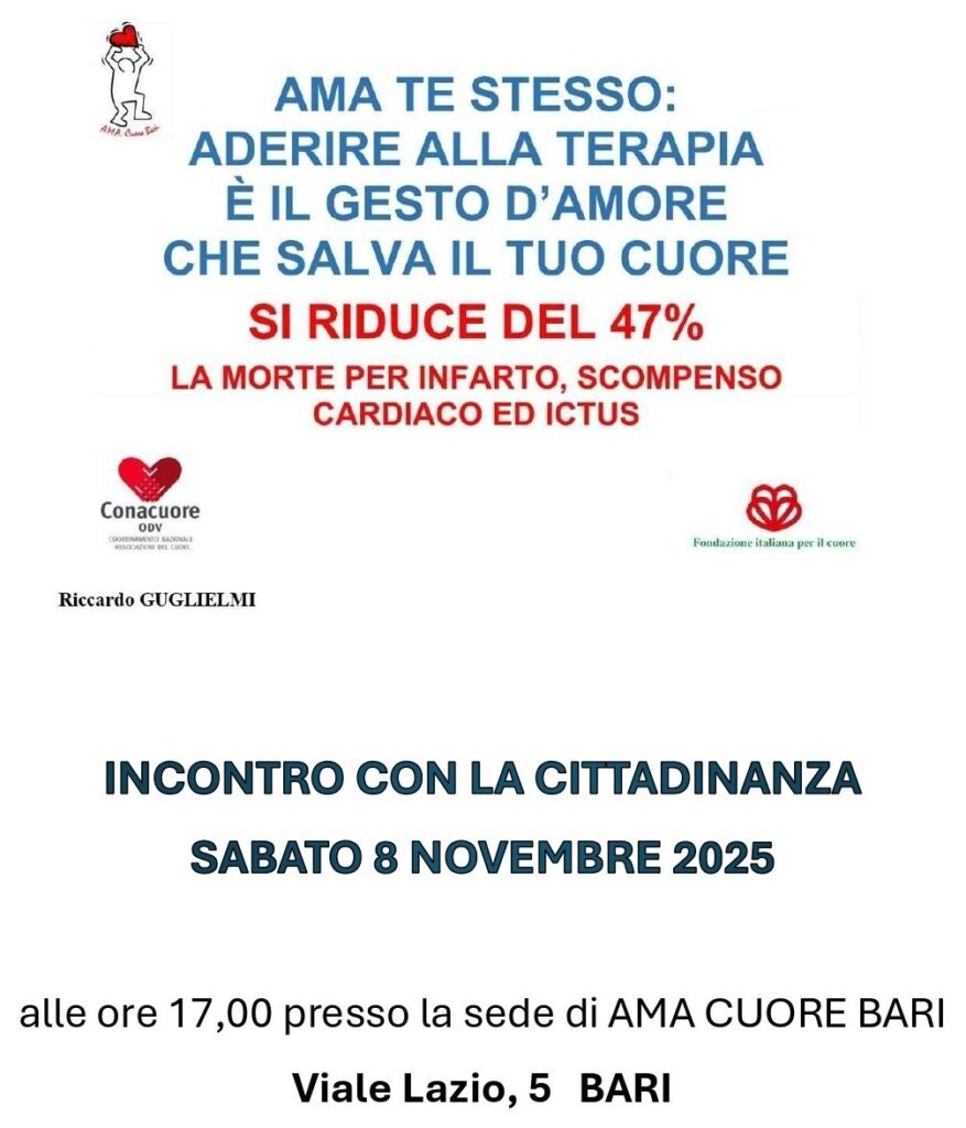 ❤️ BARI, 8 novembre 2025 – Un compleanno speciale e un messaggio che vale oro: “Aderire alla terapia è il gesto d’amore che salva il tuo cuore.” Sabato 8 novembre 2025, a partire dalle ore 17:00, l’Associazione AMA CUORE BARI – OdV (Sede operativa: Viale Lazio, 5) celebra i suoi 16 anni di attività sul territorio con un importante incontro aperto alla cittadinanza, incentrato sull’importanza cruciale dell’aderenza terapeutica.